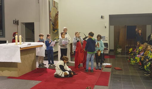 Am Abend wurden dann die gebastelten Laternen zunächst mit einer Laternenvorstellung gewürdigt, ehe sich alle auf den Weg zur Kirche begaben. Der Gottesdienst wurde dann auch maßgeblich von den Kindern gestaltet. Der Schulchor begeisterte die Gemeinschaft mit einem Auftritt in der Kirche und Schülerinnen und Schüler der vierten Klasse führten ein Martinsstück auf und brachten Fürbitten vor. Das letzte Lied endete dann in einem zauberhaften Lichterspiel: Die Kirche verdunkelte sich und alle Laternen erstrahlten im Chor.
